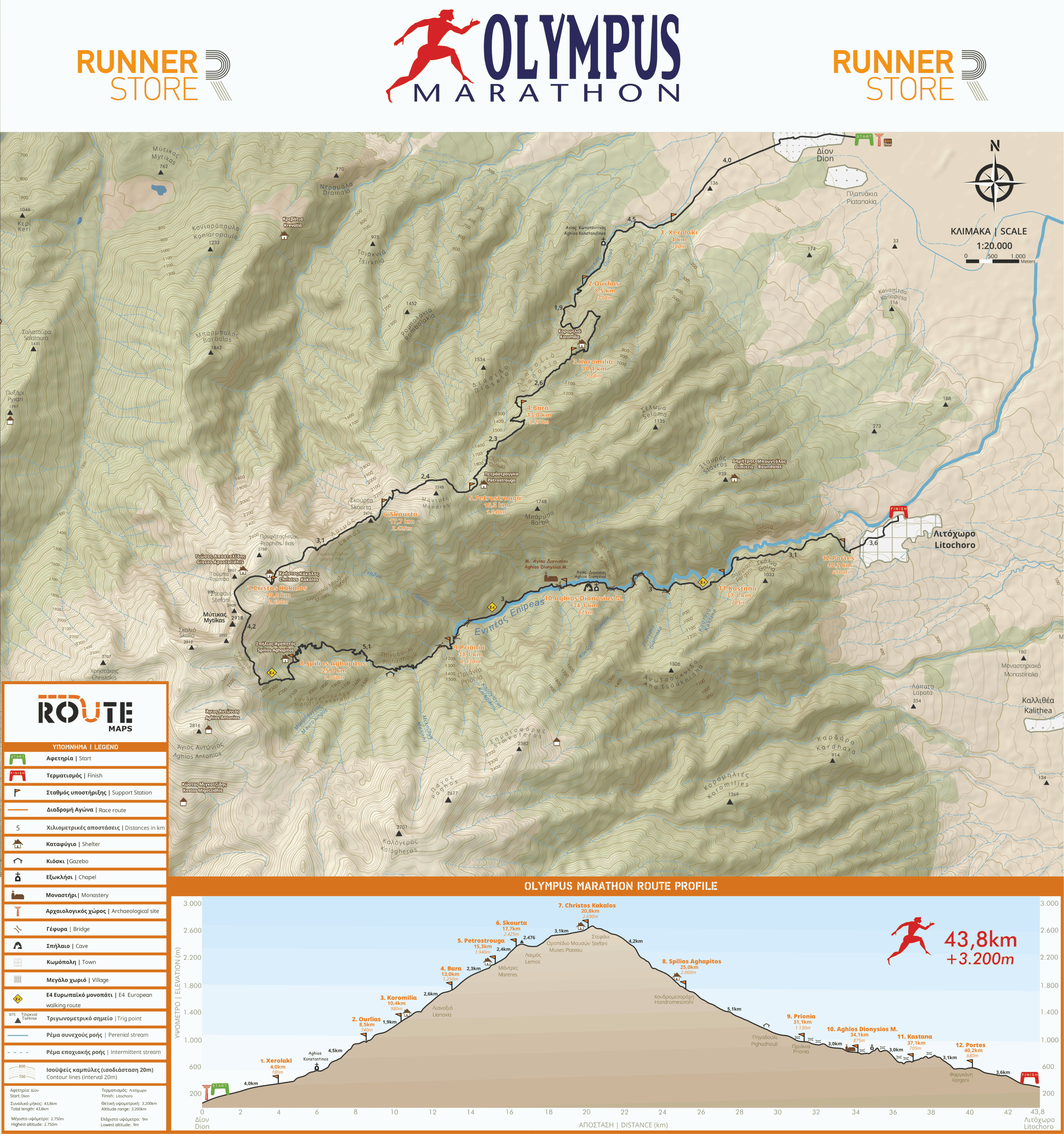 Δημιουργήσαμε τον χάρτη του αγώνα Olympus Marathon σε κλίμακα 1:20.000. Απεικονίζονται οι σταθμοί υποστήριξης, οι χιλιομετρικές αποστάσεις και η μηκοτομή της διαδρομής.